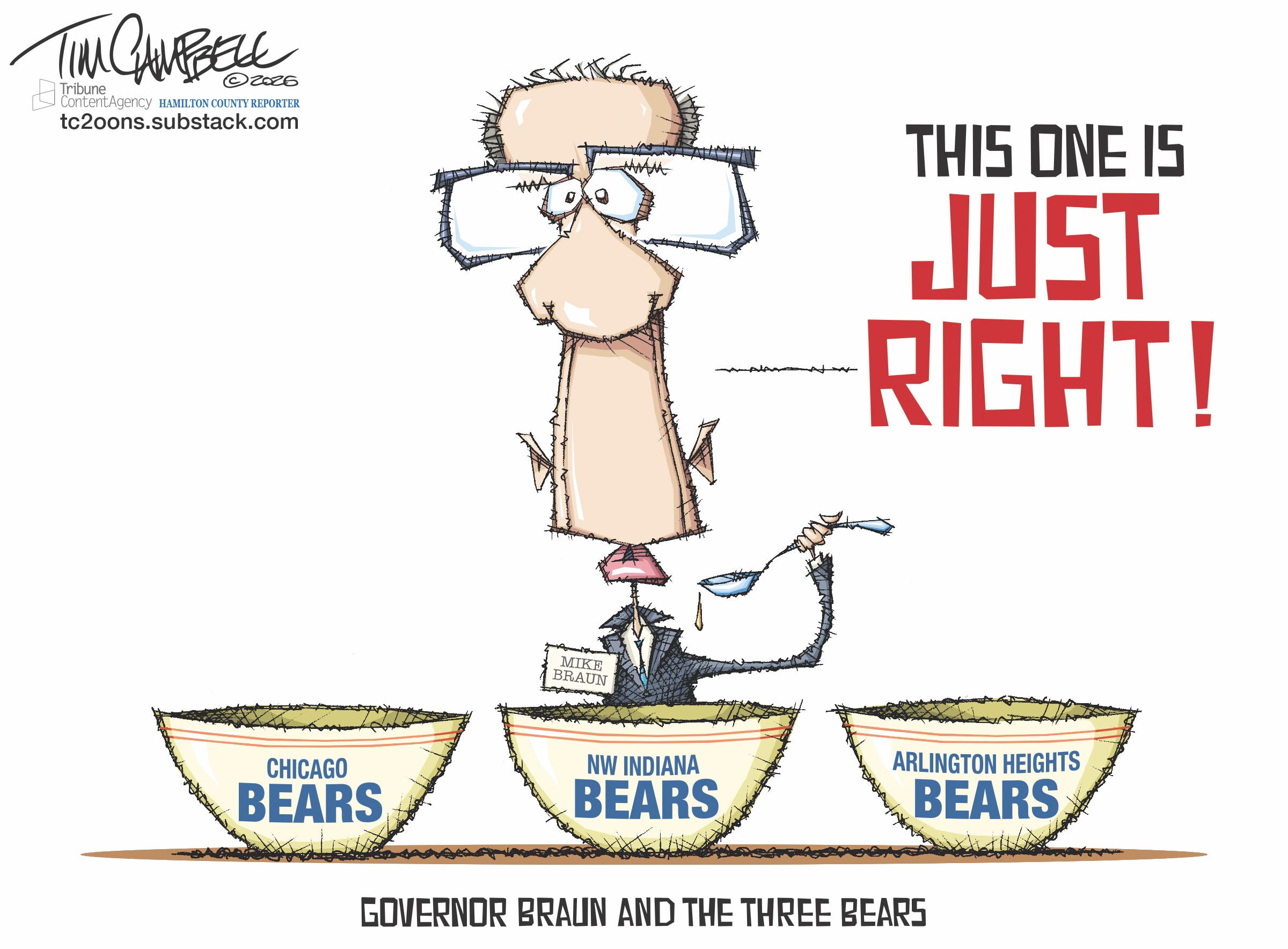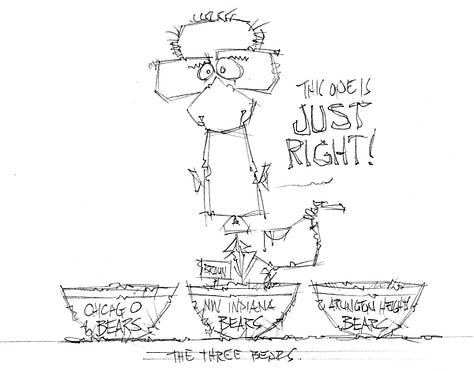 The idea for the cartoon came about when I realized that the Bears had 3 options. They could stay in Chicago, move to Arlington Heights or move to Indiana. The number 3 is what generated the idea of The Three Bears.