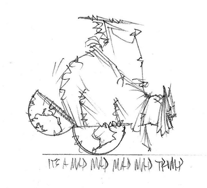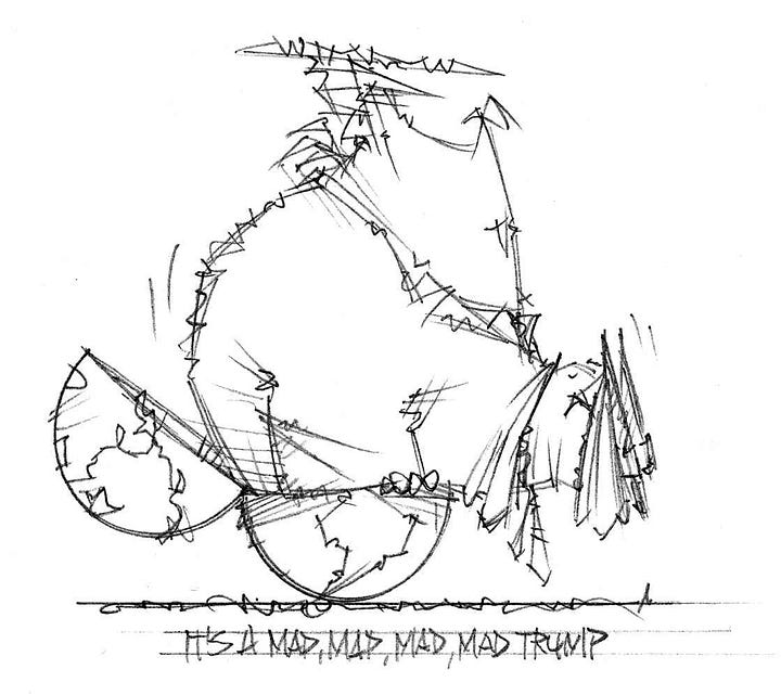 At this point I really enjoyed the drawing, but wanted to revisit the idea of adding a tagline. I thought about how crazy and pissed off Trump is right now and the word “MAD” covered both adjectives. That’s when I decided to play off the imagery of the toilet/globe and add a twist to the movie title, It’s A Mad, Mad, Mad, Mad World!